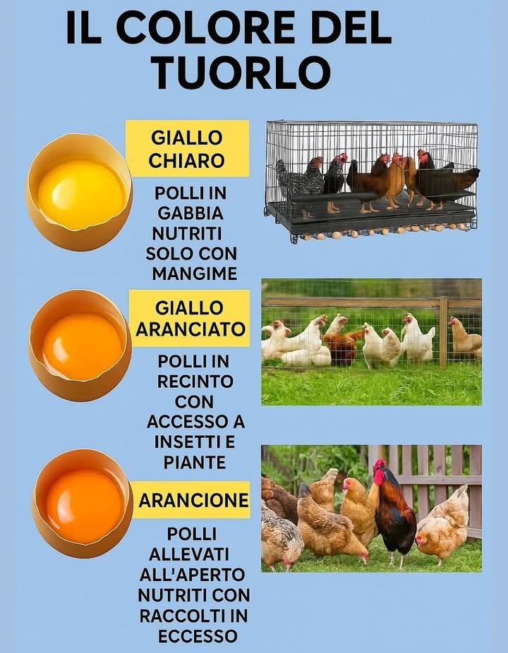 Arancione intenso: le galline allevate allaperto, con una dieta varia che include scarti di coltivazioni, verdure e insetti, producono uova con tuorli di colore più scuro e ricchi di nutrienti.