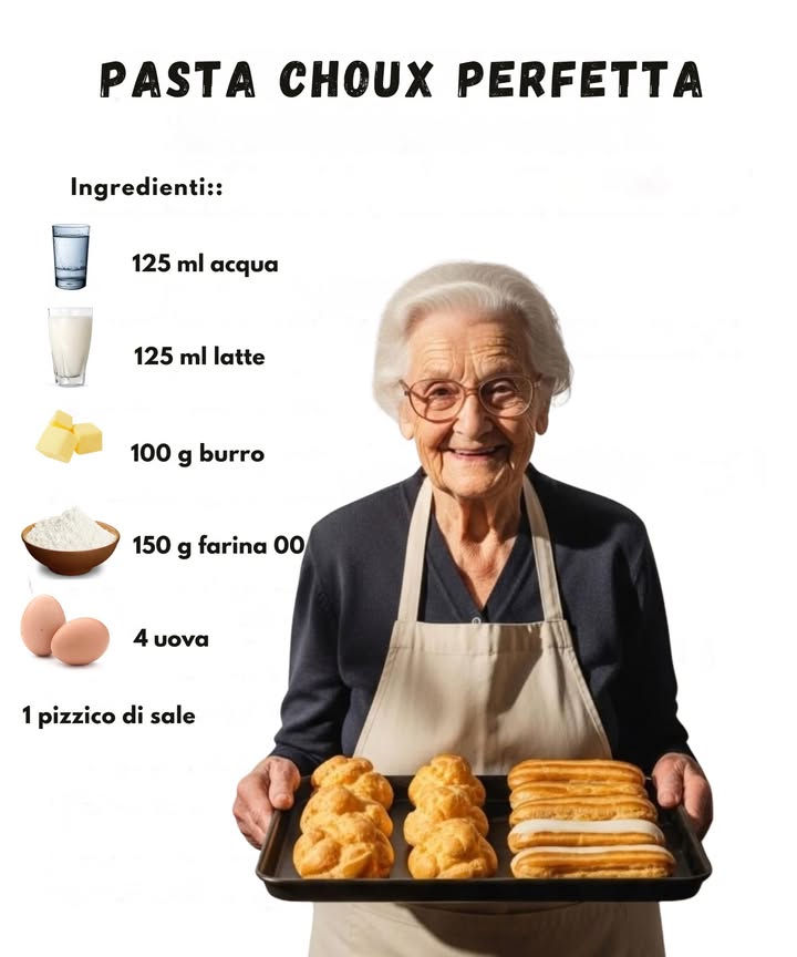 Pasta Choux Perfetta Ingredienti 125 ml acqua 125 ml latte 拏 100 g burro 杻 150 g farina 00 4 uova 讀 1 pizzico di sale 蓼 Preparazione 1 Versare acqua, latte, burro e sale in un pentolino e portare a leggero bollore. 2 Aggiungere la farina tutta in una volta e mescolare energicamente fino a ottenere un impasto compatto che si stacca dalle pareti. 3 Trasferire limpasto in una ciotola e lasciarlo intiepidire qualche minuto. 4 Incorporare le uova una alla volta, fino a ottenere una crema liscia e densa. 5 Formare bignè o éclair su una teglia e cuocere in forno caldo fino a una doratura uniforme. Una base leggera e versatile, ideale per dolci classici e farciture cremose.