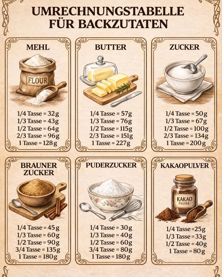 Damit ist jetzt Schluss! Mit dieser praktischen Umrechnungstabelle für Backzutaten hast du die wichtigsten Mengen immer griffbereit. Perfekt für Kuchen, Kekse, Muffins, Brot und vieles mehr!
