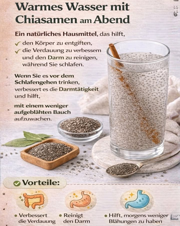 Ein Glas warmes Wasser mit Chiasamen vor dem Schlafengehen kann die Verdauung unterstützen und für ein leichteres Gefühl am Morgen sorgen.